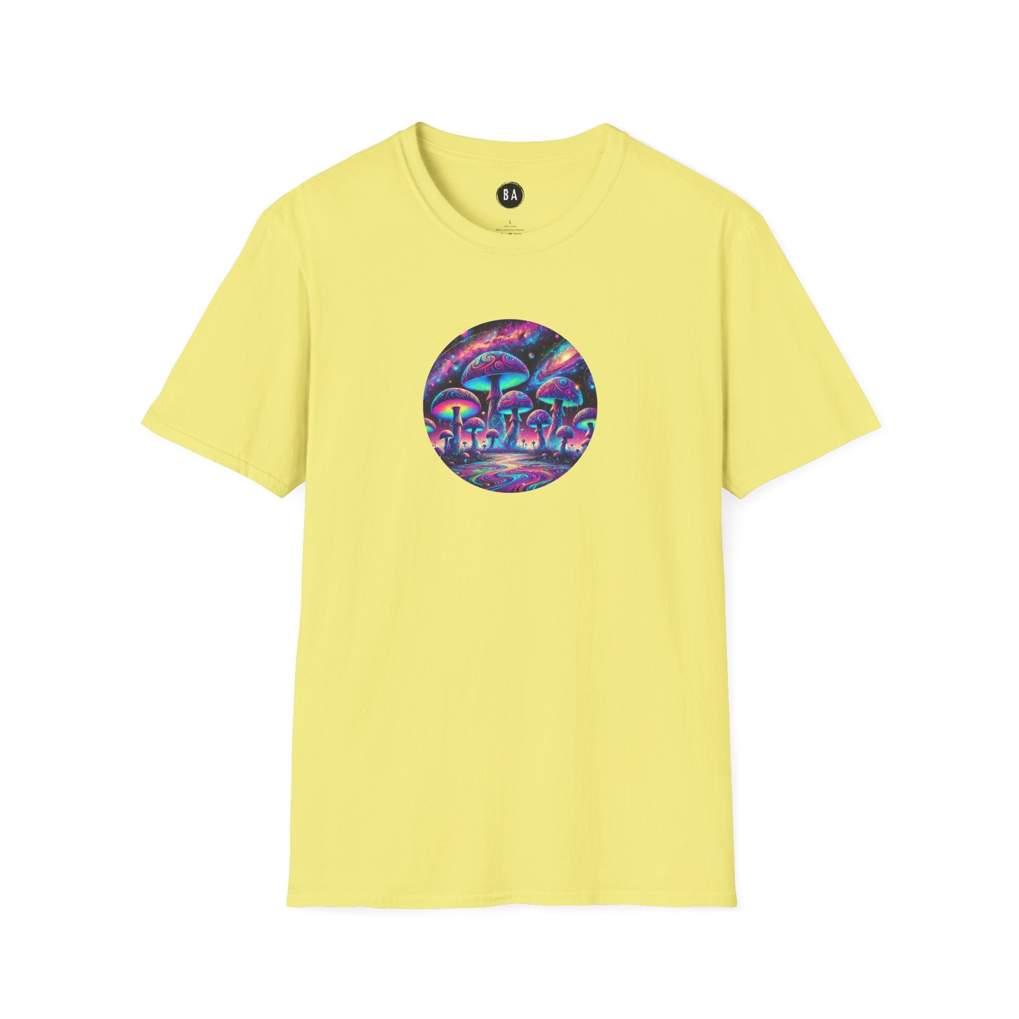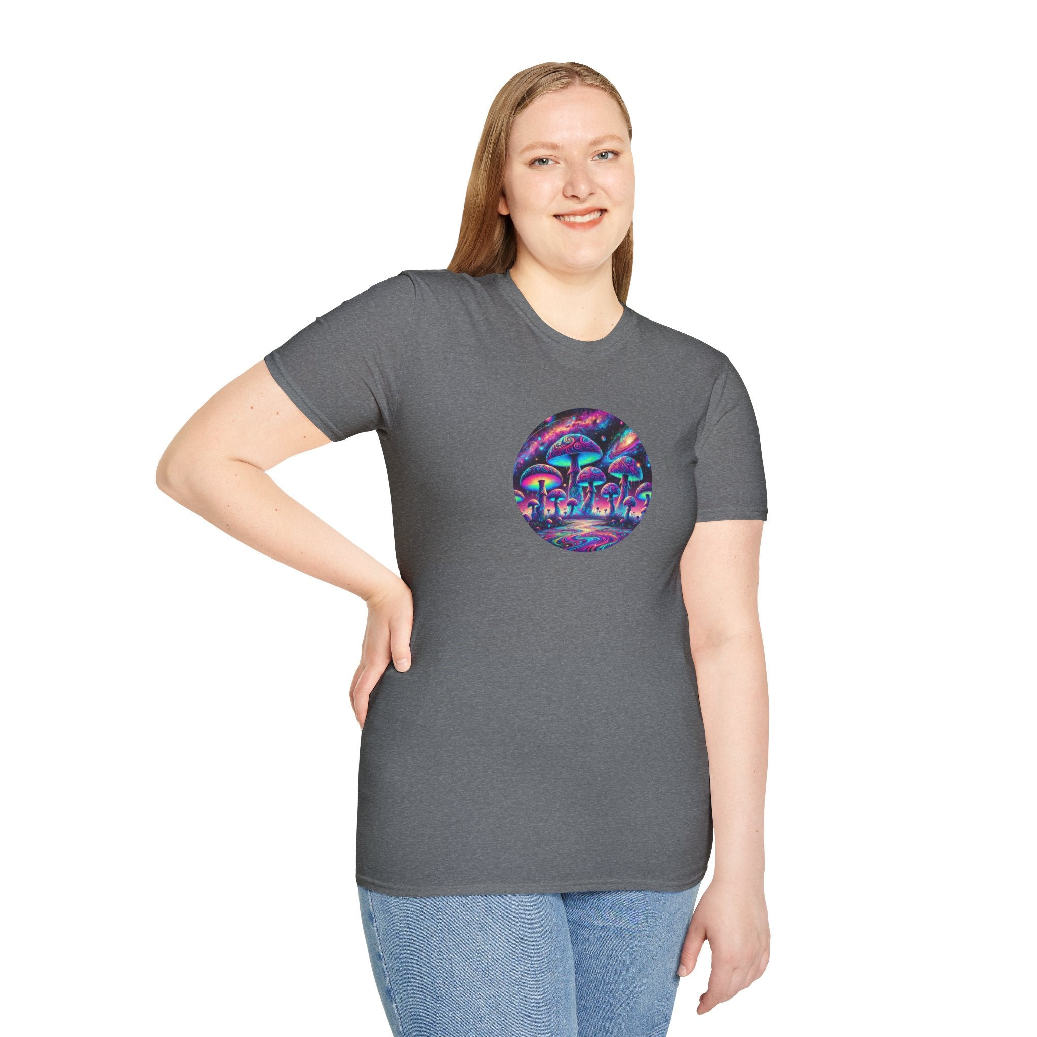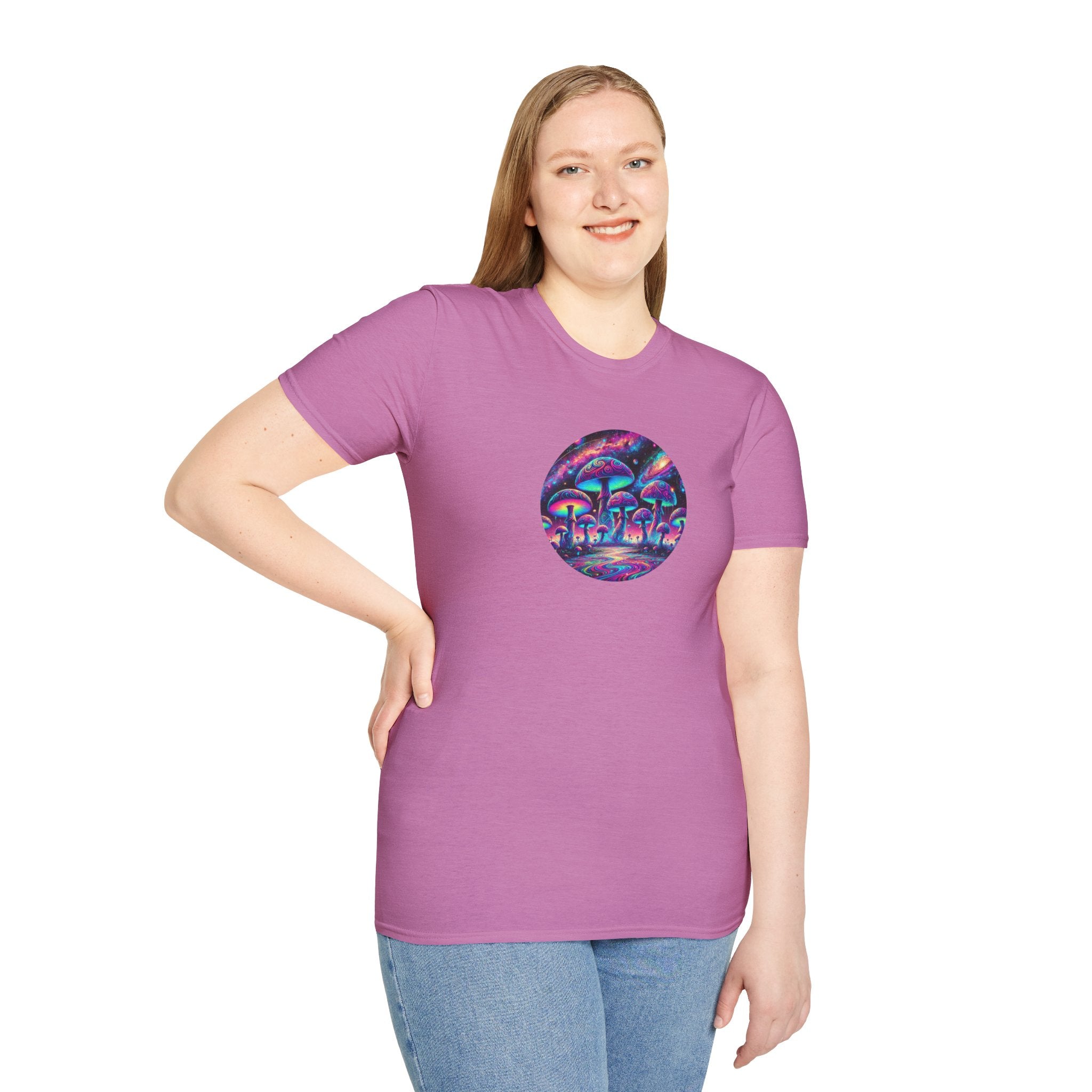 Step into a world of vibrant imagination with our Cosmic Mushroom Field T-Shirt! This stunning design features a glowing array of psychedelic mushrooms set against a surreal, cosmic backdrop of swirling galaxies and radiant nebulae. The intricate details and vivid neon colors—purples, blues, pinks, and greens—make this shirt a wearable masterpiece.